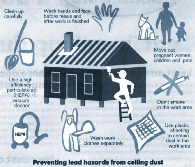 Black trails of dust near cracks or cornices are trouble signs. Decorative ceiling roses with air vents can also let dust in Water damage may cause ceilings to crack or collapse. What to do Test the dust for lead Assume dust In pre·1970 houses contains lead unless tests prove otherwise. To be sure, hire a professional lead assessor or carefully collect samples yourself and have them tested by a laboratory (see 'How to get advice', below) Have lead dust removed from your house Pregnant women, children and pets should move out until the clean-up is finished or stay away from the work area. Do-it-yourself ceiling dust removal is not recommended – it’s dirty and dangerous and requires special equipment. Hire a professional (see 'How to get advice', below). If you do remove the dust yourself. do it safely Take precautions to ensure dust does not enter living areas through the access hole into the ceiling.