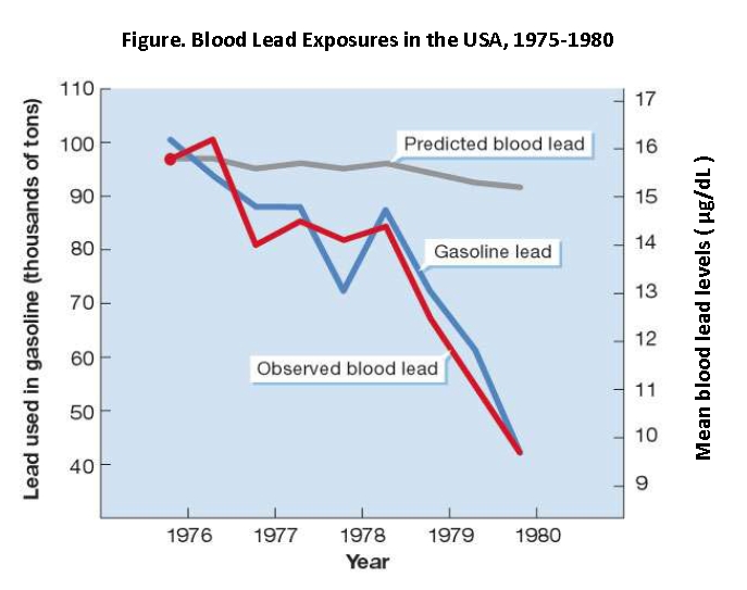 Exposure models predicted that lead levels in the population would change very little, but biomonitoring at the CDC found the opposite: as lead levels in gasoline declined, so did blood lead in the US population. Today, the average US citizen has a blood lead level under 2µg/dL. The level that triggers public health action to prevent further exposure is 5µg/dL, and the average 1976 blood lead level is now considered lead poisoning. 1970 – US Environmental Protection Agency created. Car manufacturers ordered to begin building engines to run on unleaded gasoline by 1975. Ethyl Corp. unsuccessfully opposes phase-out of leaded gasoline in courts. 1970 – US auto makers develop catalytic converter as a stop-gap technology while they develop cleaner engines. TEL poisoned the catalytic converters so the pressure was on to get lead-free gasoline (petrol) on the market to permit catalytic converters. In response to this the US Environmental Protection Agency (EPA) orders introduction of unleaded gasoline and issues an order for lead-gasoline-free cars by 1975, thus beginning the world’s first national phase-out of leaded petrol. A health model predicted that the effect of the introduction of unleaded gasoline on lead concentrations in the blood of US residents would be minor. Ref and graph (adapted from USCDC) (Sexton et al 2004 ) 1971 July – Japan introduces a maximum permissible level of 0.31 grams of lead per litre (IPCS 1977) which may have been the first such restriction and thus the first national lead-in-petrol phase-down policy. 1972 Apr – Unleaded petrol begins to be marketed in Japan. (IPCS 1977) 1975 - New US car models made with catalytic converters which require unleaded gasoline. Ethyl Corp. unsuccessfully proposes "lead tolerant" catalytic converters. (Kovarik 2011) 1976 Mar – US Court of Appeals ratifies maximum permissible level of 0.13 g of lead per litre of gasoline by 1 January 1979. (IPCS 1977) 1977-82 - Extensive tests by public health scientists show marked correlations between high levels of lead in children's blood and brain damage, hypertension and learning disorders. 1981 – The US EPA notes that between 1970 and 1979 a 41% drop in the composite maximum quarterly average of ambient air-lead concentrations at 105 sites across the nation was accompanied by a 40% drop in the amount of lead consumption in gasoline, excluding sales to the military. (Pirkle Et al 1983) 1983 June - The Second National Health and Nutrition Examination Survey (NHANES II) reveals a precipitous decline in blood lead levels in all segments of the US population, a drop of 37% (from 14.6 to 9.2, a drop of 5.4 micrograms per deciliter) between Feb 1976 and Feb 1980, closely paralleling the contemporaneous decline in the amount of lead added to gasoline. [See graph above.] (Pirkle et al 1983) 1984 - City of Chicago first to order end of all leaded gasoline sales since New York City ended ban on leaded gasoline in 1928. (Kovarik 2011) 1985 – US EPA’s estimates based on Pirkle et al (1983) indicate that lead in gasoline in the United States may be responsible for well over one million cases of hypertension per year and for over 5,000 deaths from heart attacks, strokes, and other diseases related to blood pressure. Moreover, these estimates cover only males aged 40 to 59 and, in the case of heart attacks, strokes, and deaths, only white males in that age group. In their estimation of the total benefits of a phase down of gasoline some other impacts were also addressed, for example Children’s Health Effects. US EPA’s estimation of the total benefit of a phase down of leaded petrol was: “7.9 billion, while the estimated cost is only $607 million, resulting in net benefits of $7.3 billion”. (Schwartz et al 1985) 1986 – Japan (probably due to its Minamata mercury tragedy and high value placed on IQ and longevity, or perhaps due to pressure from its auto-makers to be able to include catalytic converters on all new vehicles) became the first nation to fully phase-out leaded petrol. |